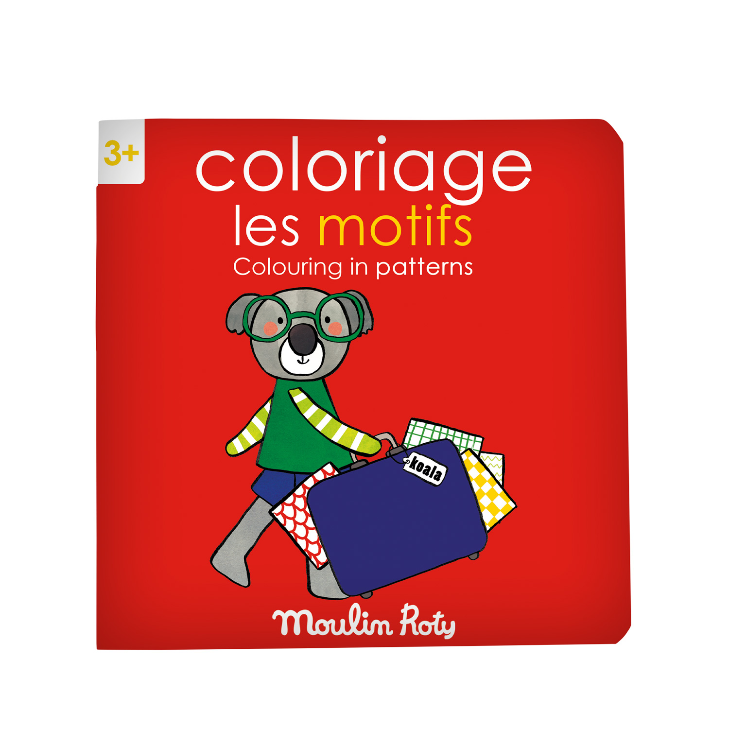 Cahier de coloriage éducatif 1er âge de 20 pages sur le thème des motifs, en français/anglais. Les personnages Popipop et leurs objets du quotidien dessinés au trait noir sur fond blanc sont à compléter suivant le modèle sur la page en vis-à-vis.