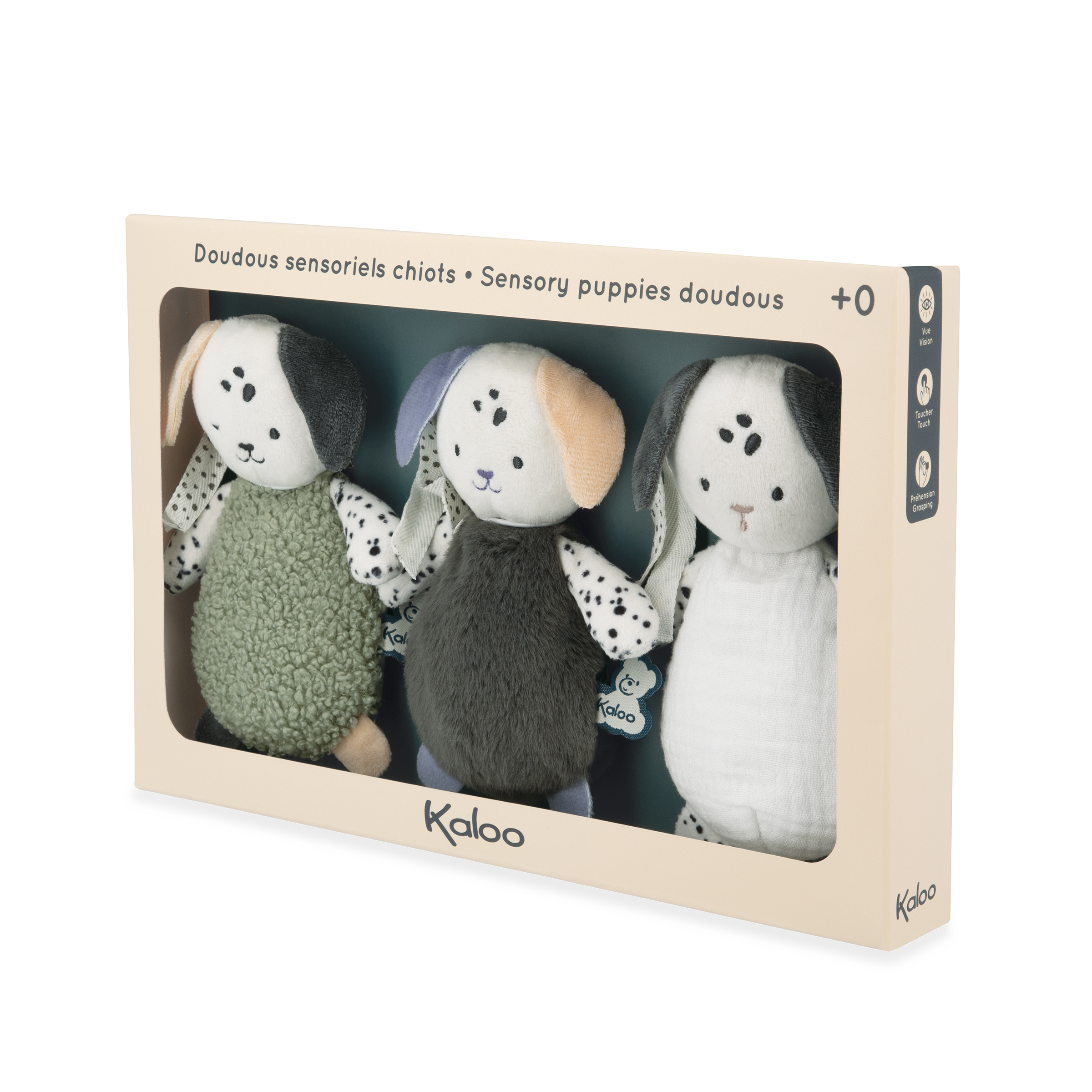 Développé en collaboration avec des psychomotriciens, ce set de doudous chiots sensoriels nomade est idéal à transporter et accrocher partout avec ses rubans afin déveiller bébé dès la naissance. Ces 3 formes de chiots aux couleurs et textures différentes (1 doudou bruissant, 1 doudou tout doux lesté et 1 doudou léger) permettent de développer les sens de bébé. La préhension fine sera stimulée grâce aux tissus avec différentes textures pour familiariser bébé à des sensations tactiles variées. Les couleurs et imprimés à pois contrastés permettront de développer la vue de bébé. Enfin, laissez bébé découvrir par lui-même les différents touchers en plaçant les petits chiots près de lui. Il va ainsi développer ses compétences sensori-motrices. Lavage en machine à 30°C. Dès la naissance.