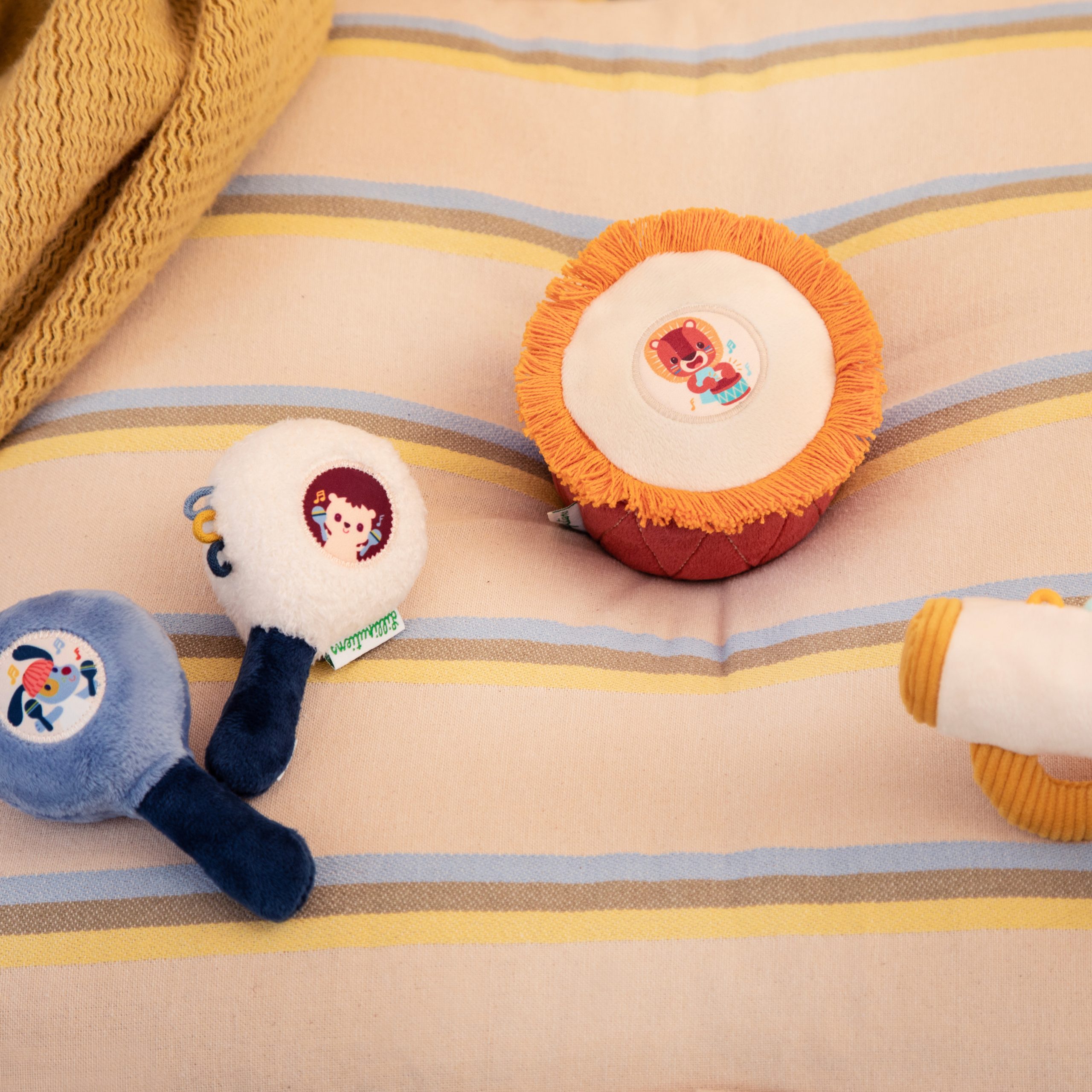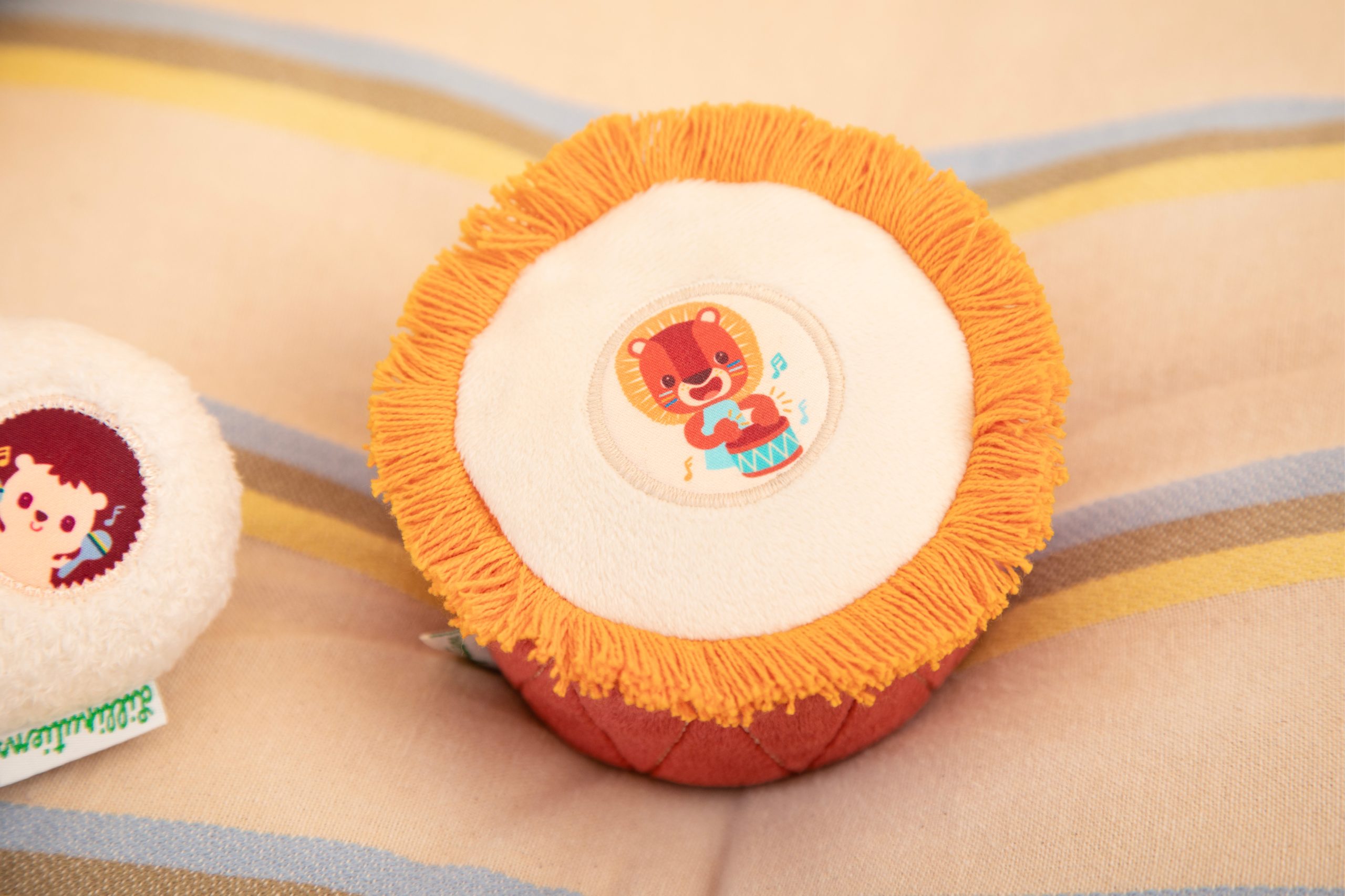 Jouer de la musique c’est chouette, surtout avec un tambour qui fait de jolis sons : bruit papier et hochet. On joue, on rigole, on attrape ! Ce tambour Jack le lion stimule l’ouïe et le toucher. Quand on appuie, le hochet retentit. Bébé apprend aussi à attraper son instrument de musique tout doux.