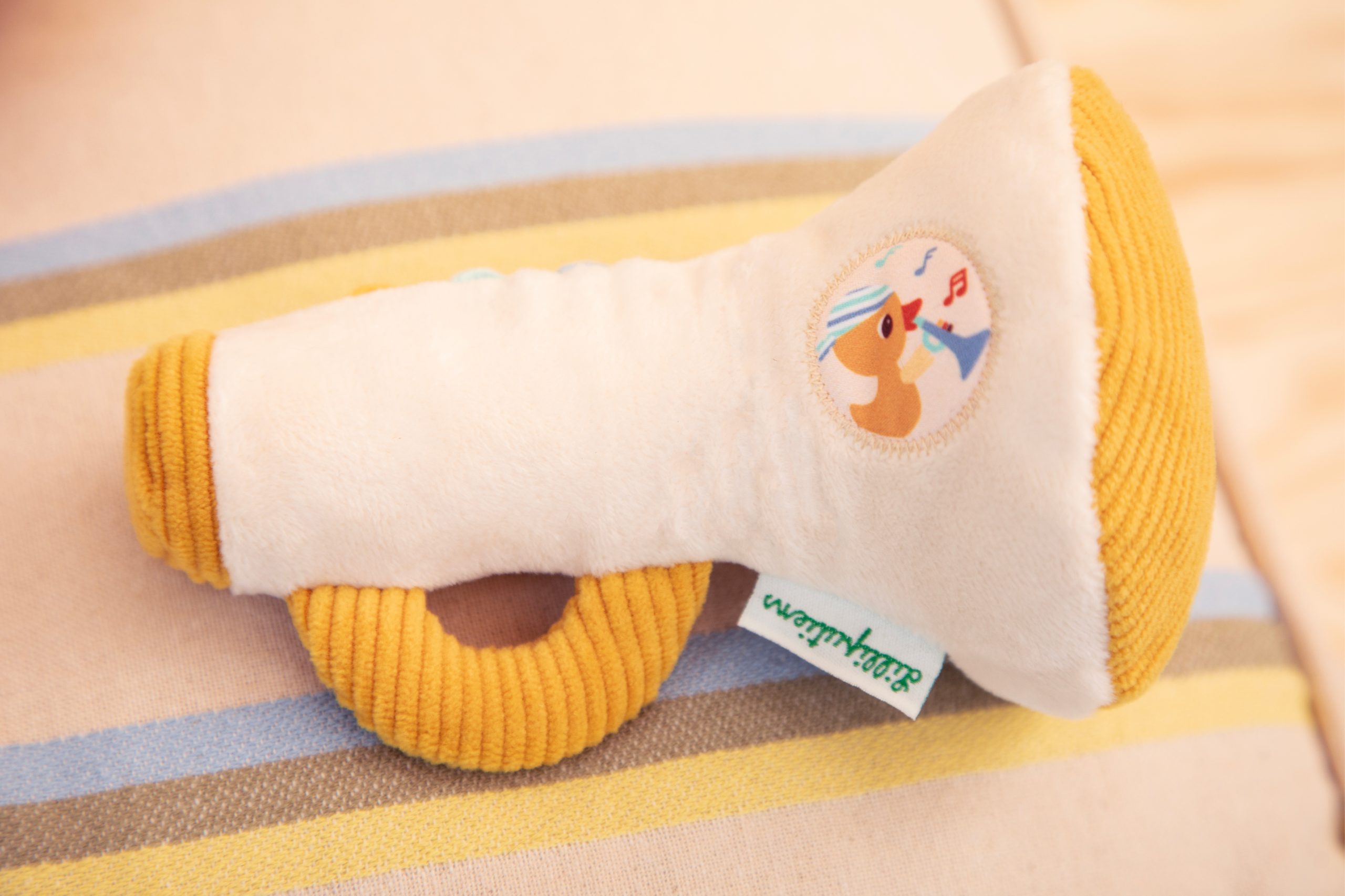 Jouer de la musique c’est chouette, surtout avec un hochet pouêt et un bruit papier dans la trompette. On joue, on rigole, on attrape ! Cette trompette Gaspard le canard stimule l’ouïe et le toucher. Grâce à sa petite poignée, bébé apprend aussi à attraper son instrument de musique tout doux.