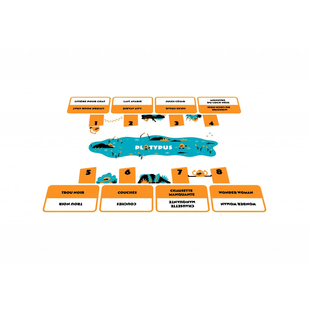 8 noms communs ou propres – les cartes Platypus – sont disposées face visible devant l’ensemble des joueurs. Les Guides connaissent la carte à faire deviner aux Explorateurs.